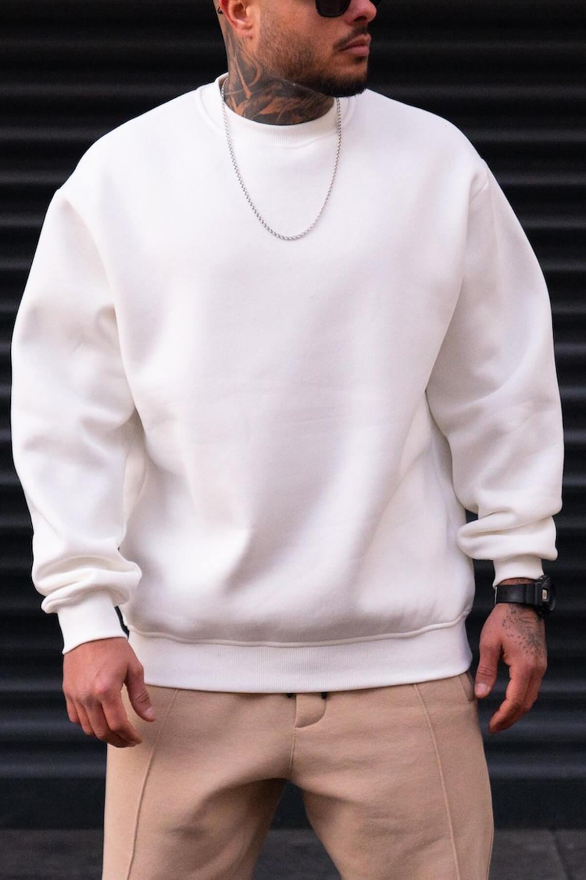 Erkek Düz Kırık Beyaz Krem Ekru Basic Baskısız Sıfır Bisiklet Yaka Oversize Salaş Sweatshirt Sweat (E6001)