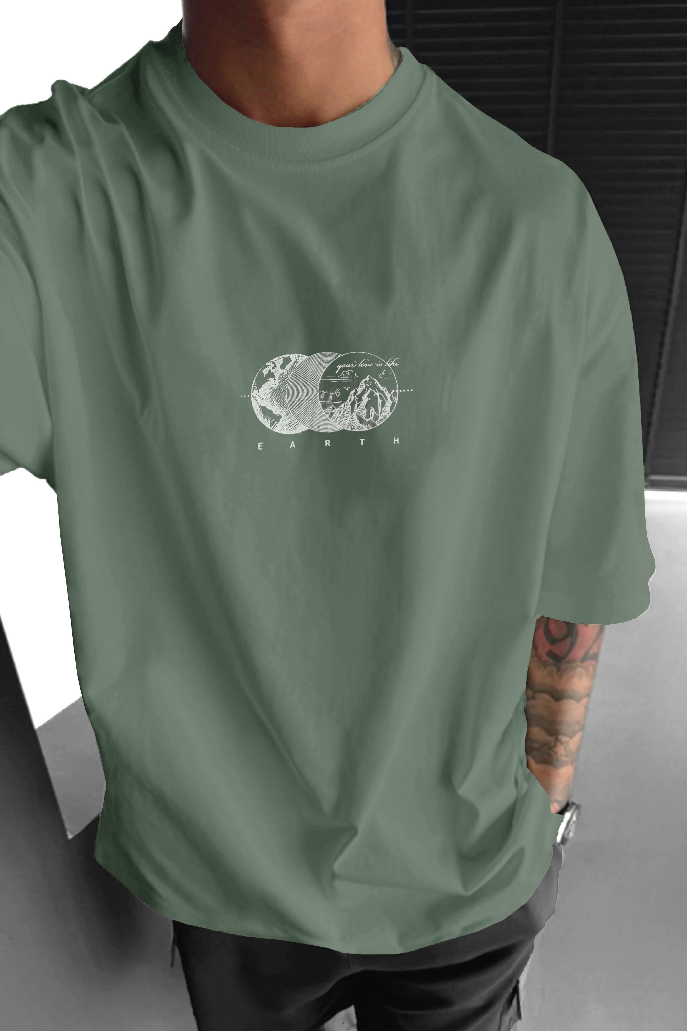 Erkek Açık Yeşil Earth Oversize Fit Bol Geniş Kalıp Salaş Kesim T-Shirt (E2302)