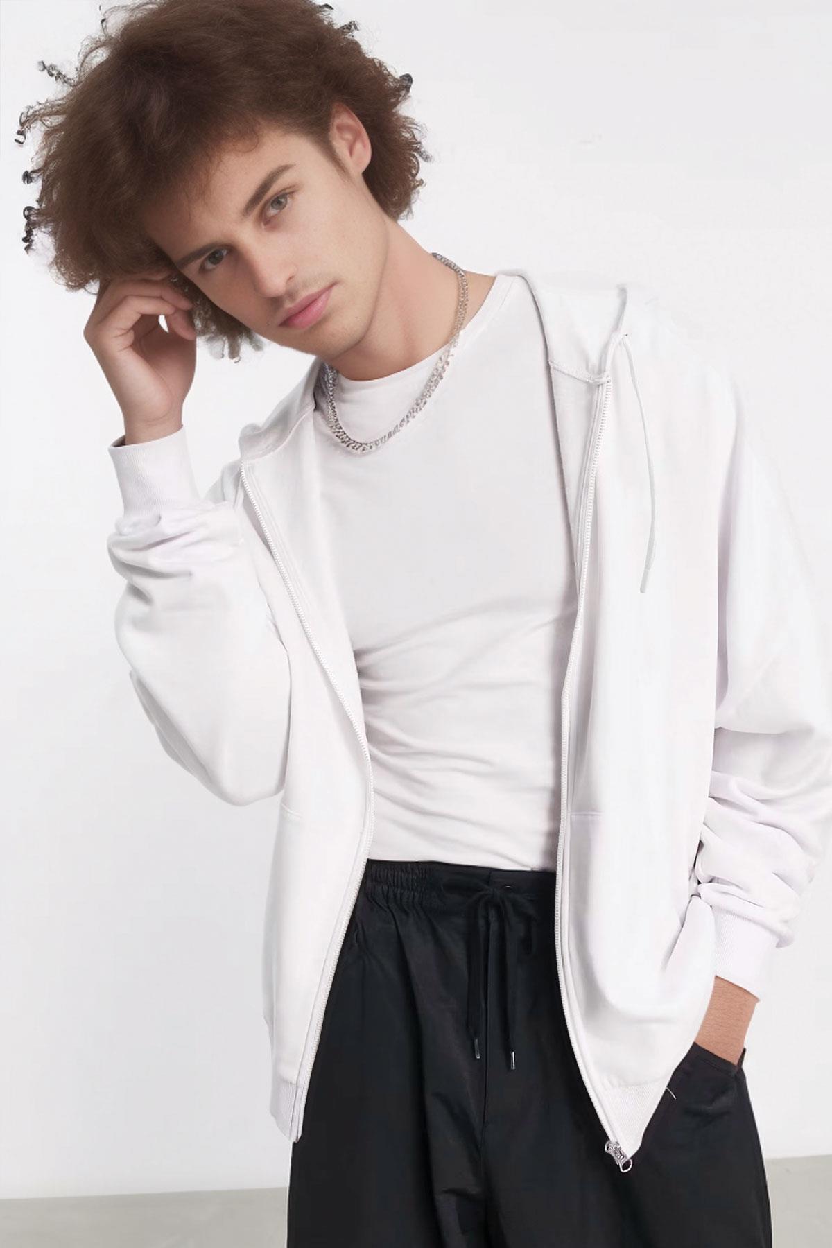 Erkek Beyaz Kapüşonlu Fermuarlı 3 Üç İplik Polar Kanguru Oversize Sweatshirt Zip Up Hoodie (E2204)