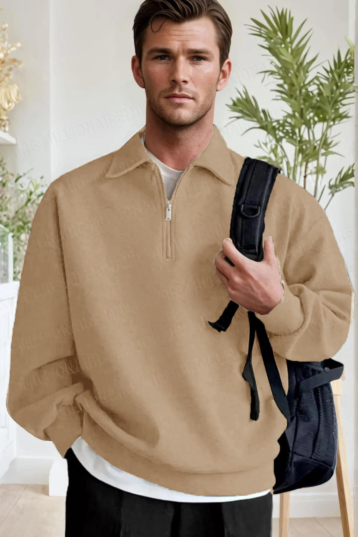 Erkek Camel Yarım Fermuar Polo Yaka 3 İplik İçi Polarlı Şardonlu Oversize Sweatshirt (EK3035)
