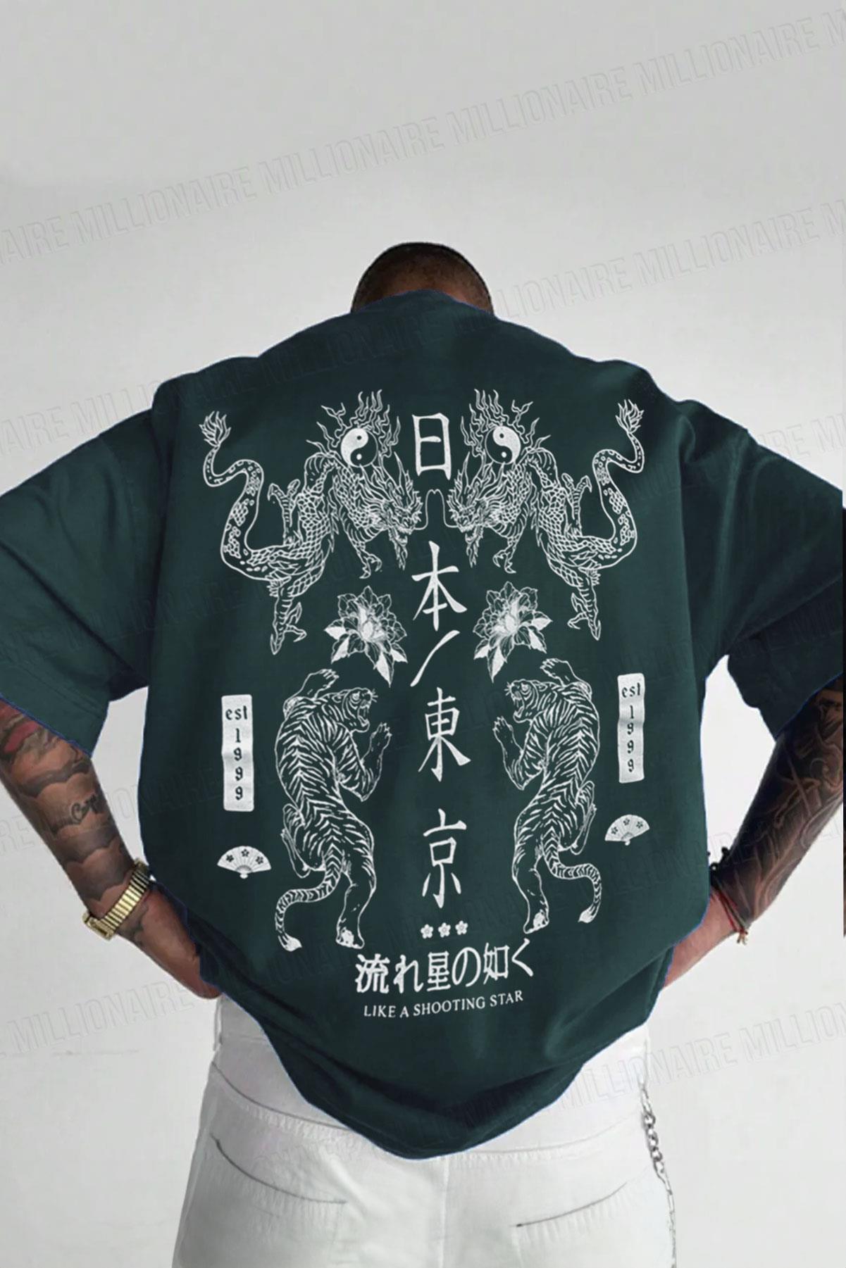Erkek Dragon Baskılı Petrol Yeşili Bisiklet Yaka Oversize Salaş T-Shirt (E3011)