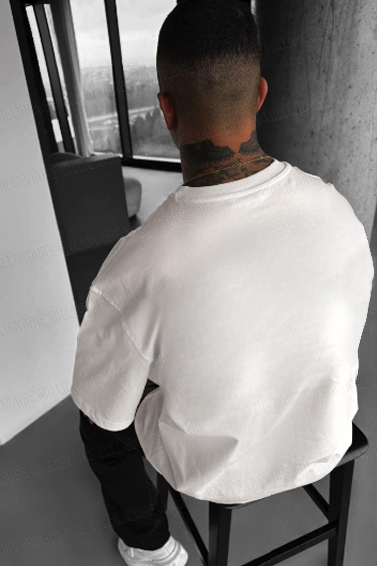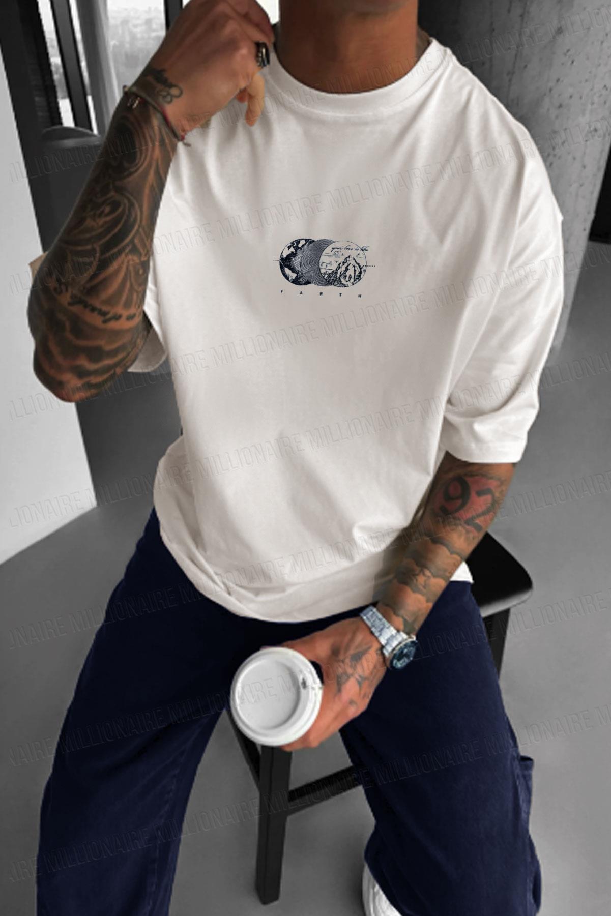 Erkek Ekru Beyaz Earth Oversize Fit Bol Geniş Kalıp Salaş Kesim T-shirt (E2302)