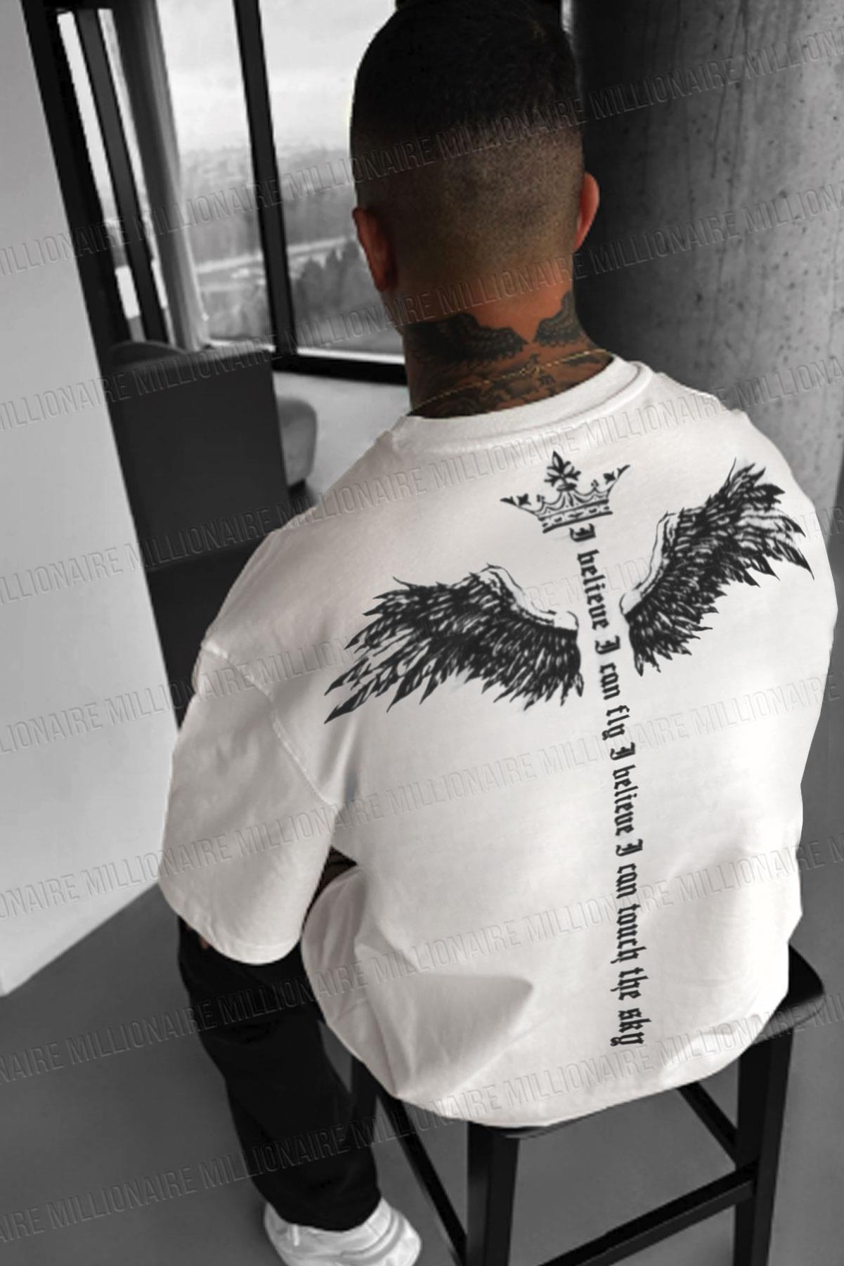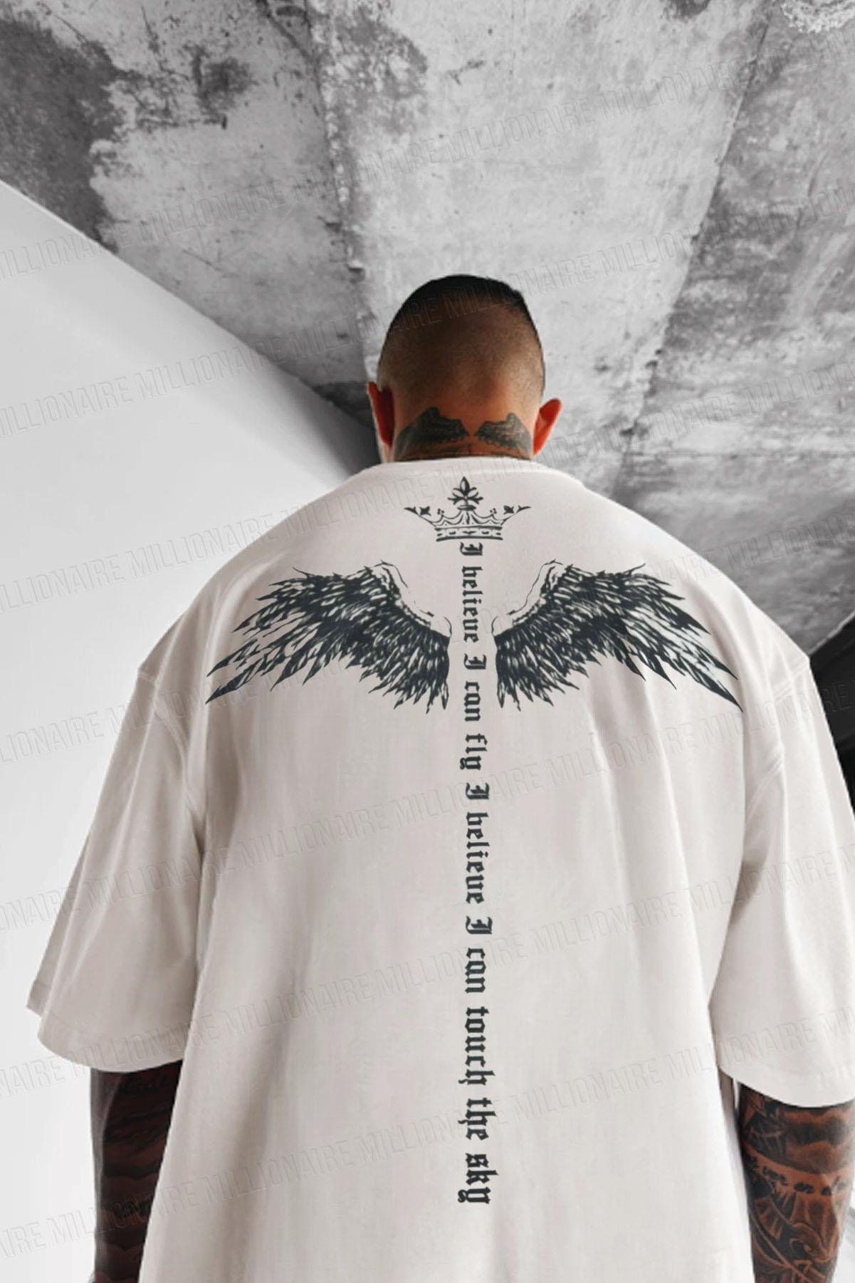 Erkek Ekru Beyaz I Can Fly Oversize Fit Bol Geniş Kalıp Salaş Kesim T-shirt (E2306)