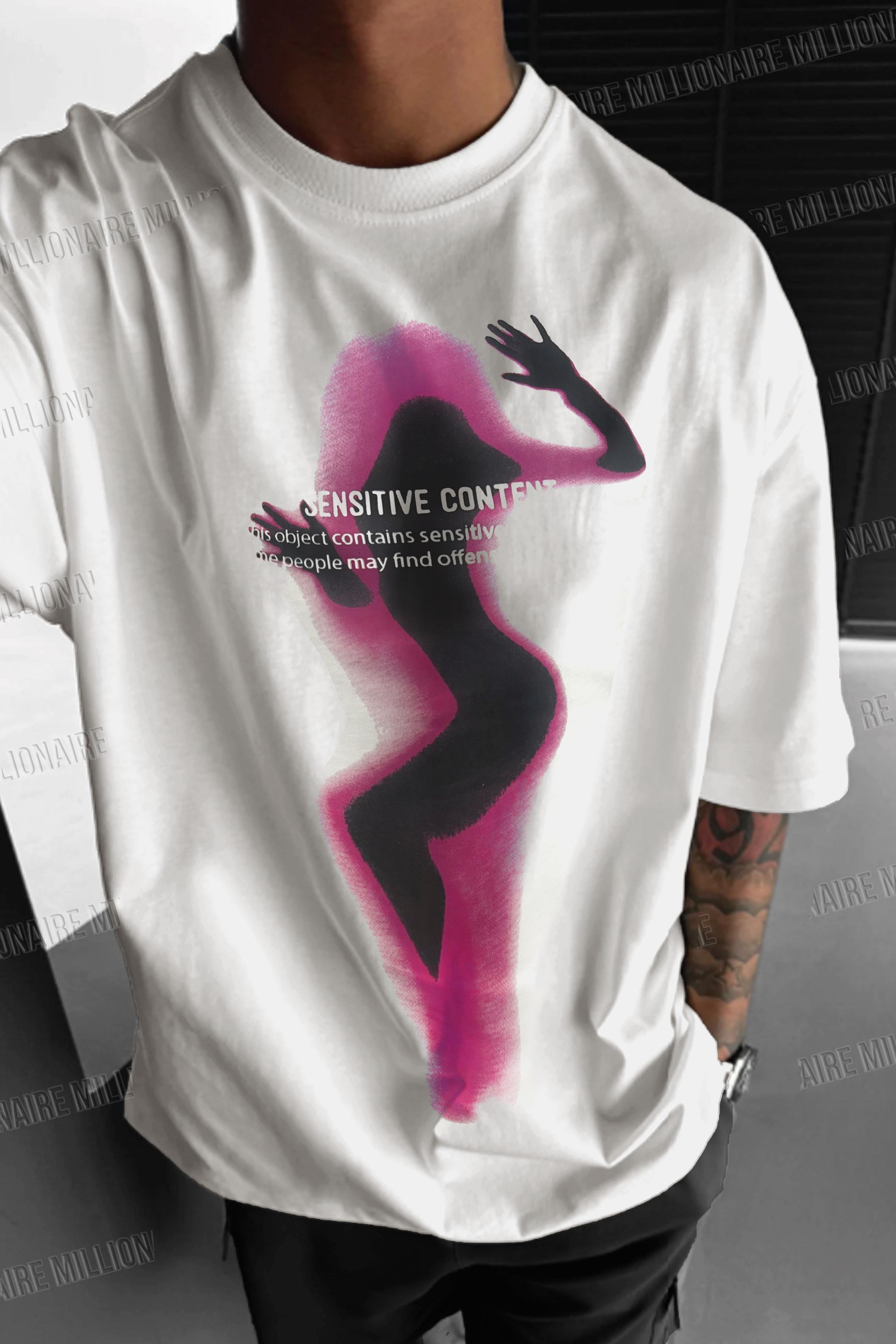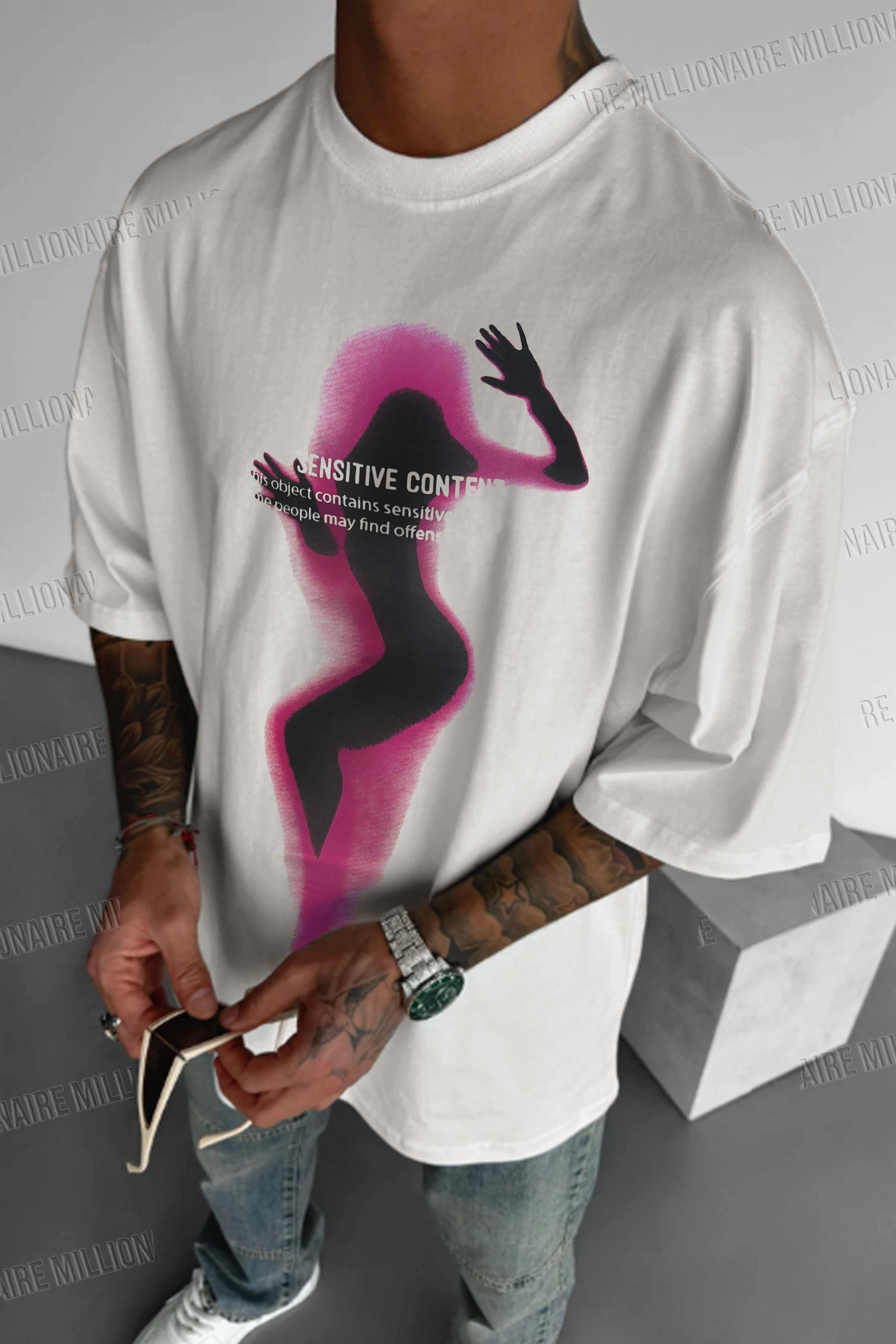 Erkek Ekru Beyaz Siluet Sensitive Content Oversize Fit Bol Geniş Kalıp Salaş Kesim T-shirt (E2309)