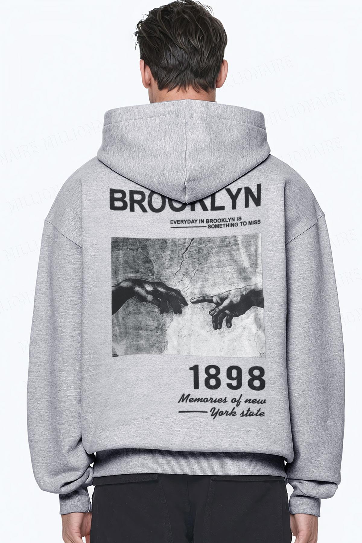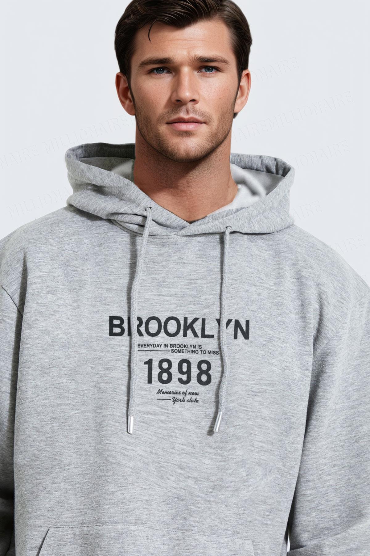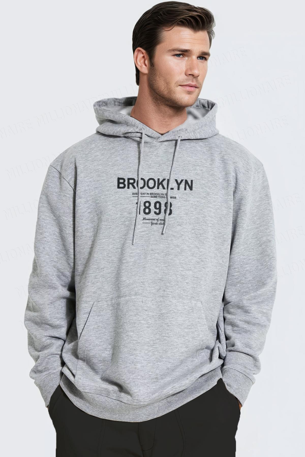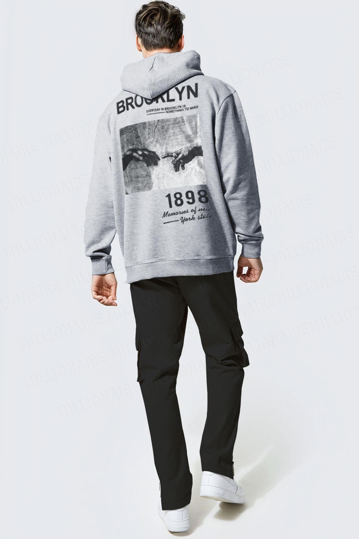 Erkek Gri 1898 Baskılı Kapüşonlu Oversize 3 iplik Şardonlu Salaş Bol Kesim Hoodie Sweatshirt (E6005)