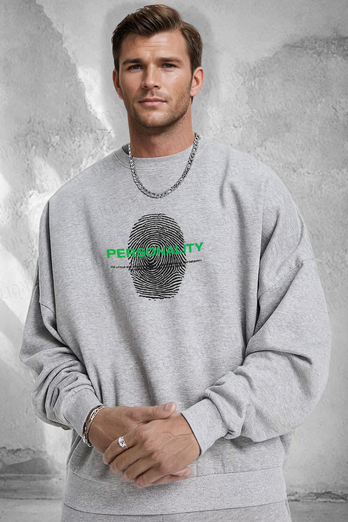 Erkek Gri Personality Baskılı 0 Sıfır Yaka Oversize Salaş Bol Kesim Polar Sweatshirt (EK3021)