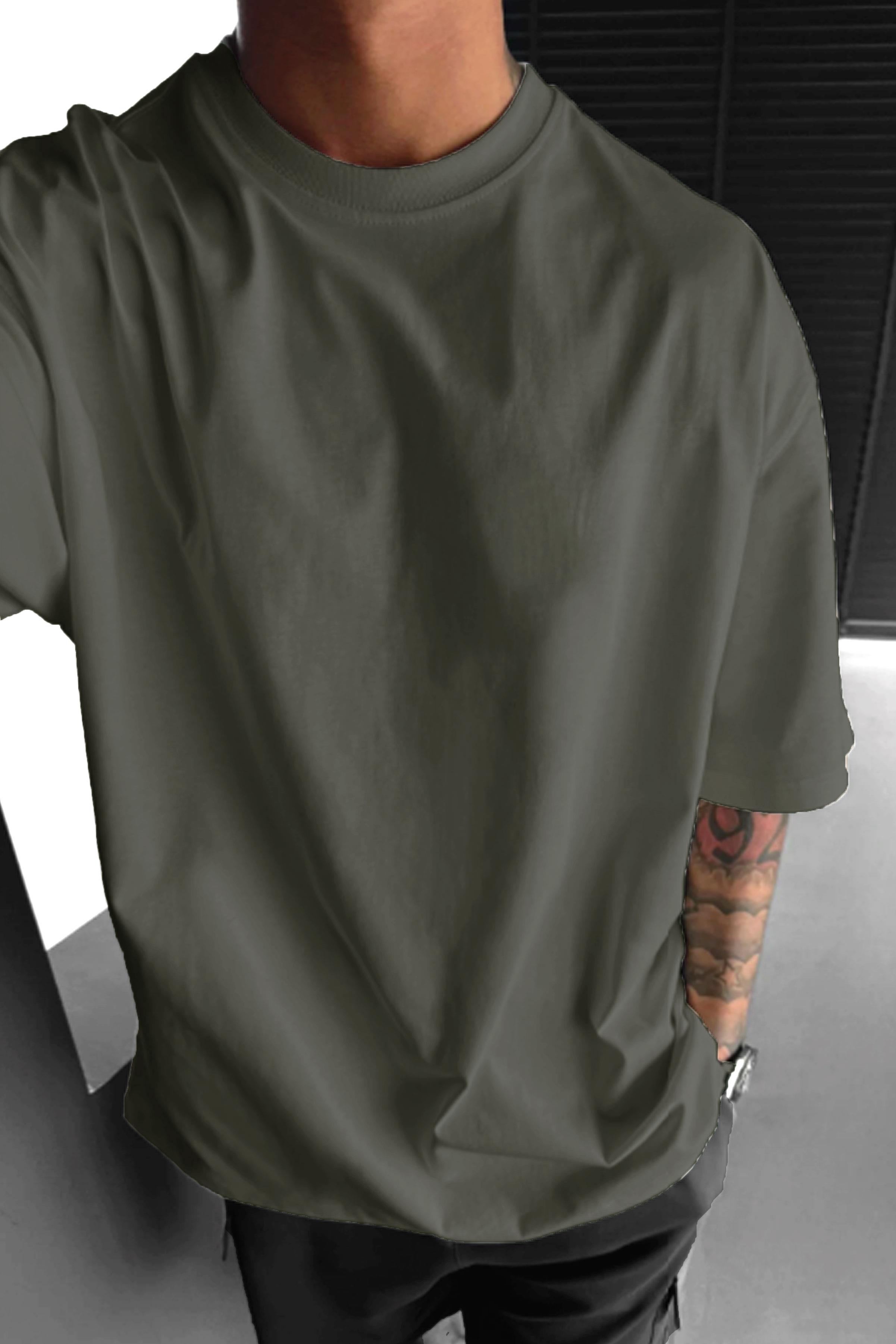 Erkek Haki Yeşili Bisiklet Yaka Düz Basic Baskısız Oversize Salas T-Shirt (E2211)