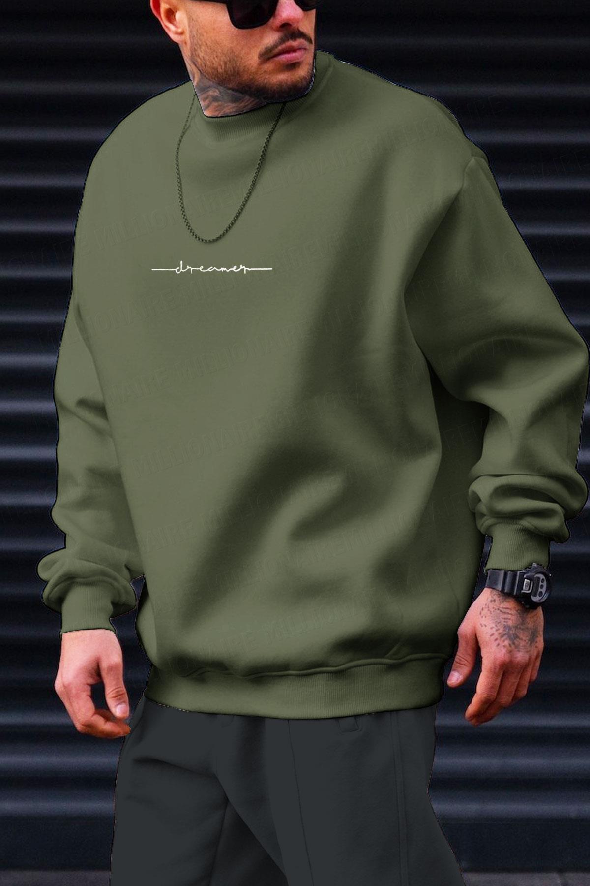 Erkek Haki Yeşili Dreamer Baskılı 0 Sıfır Yaka Oversize Salaş Bol Kesim Polar Sweatshirt (E6004)