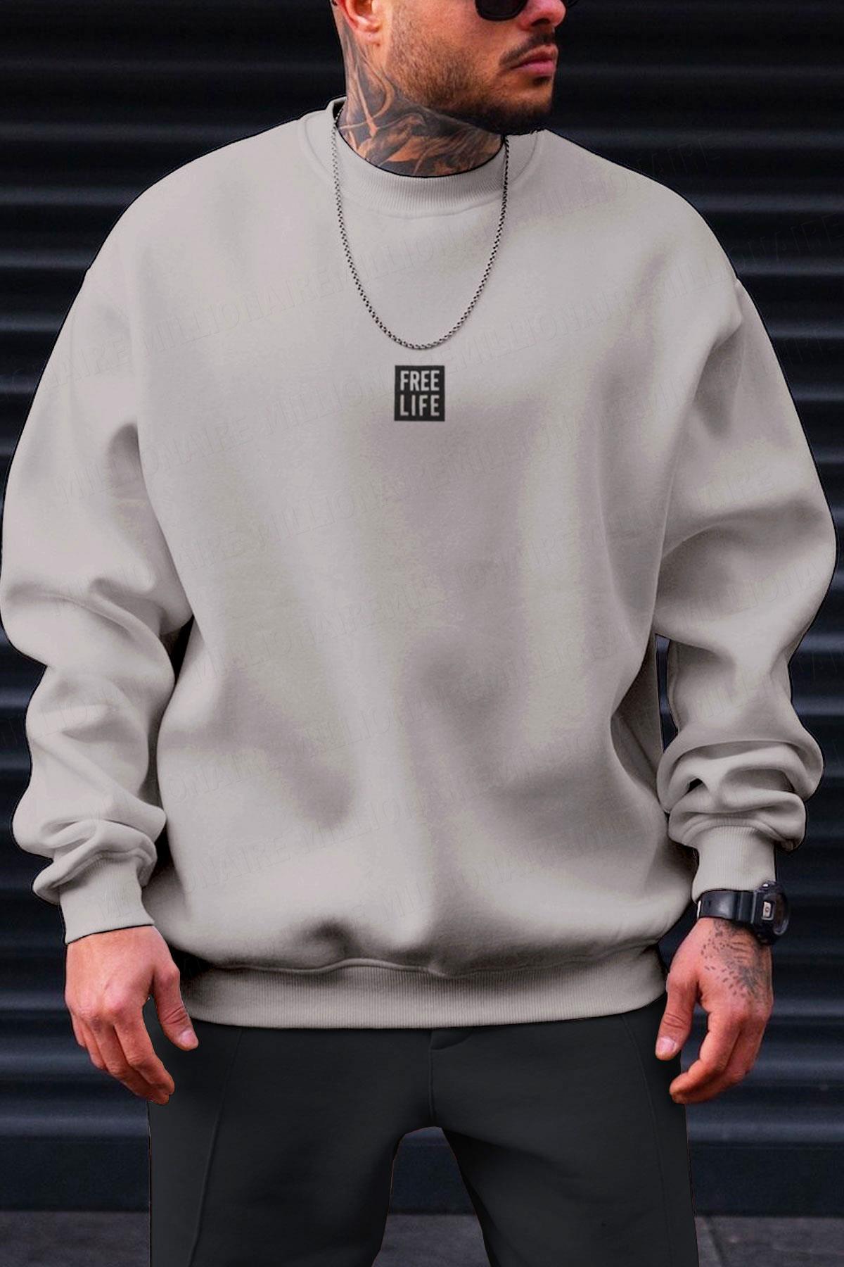 Erkek Koyu Gri Free Life Baskılı Kalın Soft 3 İplik içi Şardonlu 0 Sıfır Yaka Oversize Salaş Sweatshirt (EK3001)
