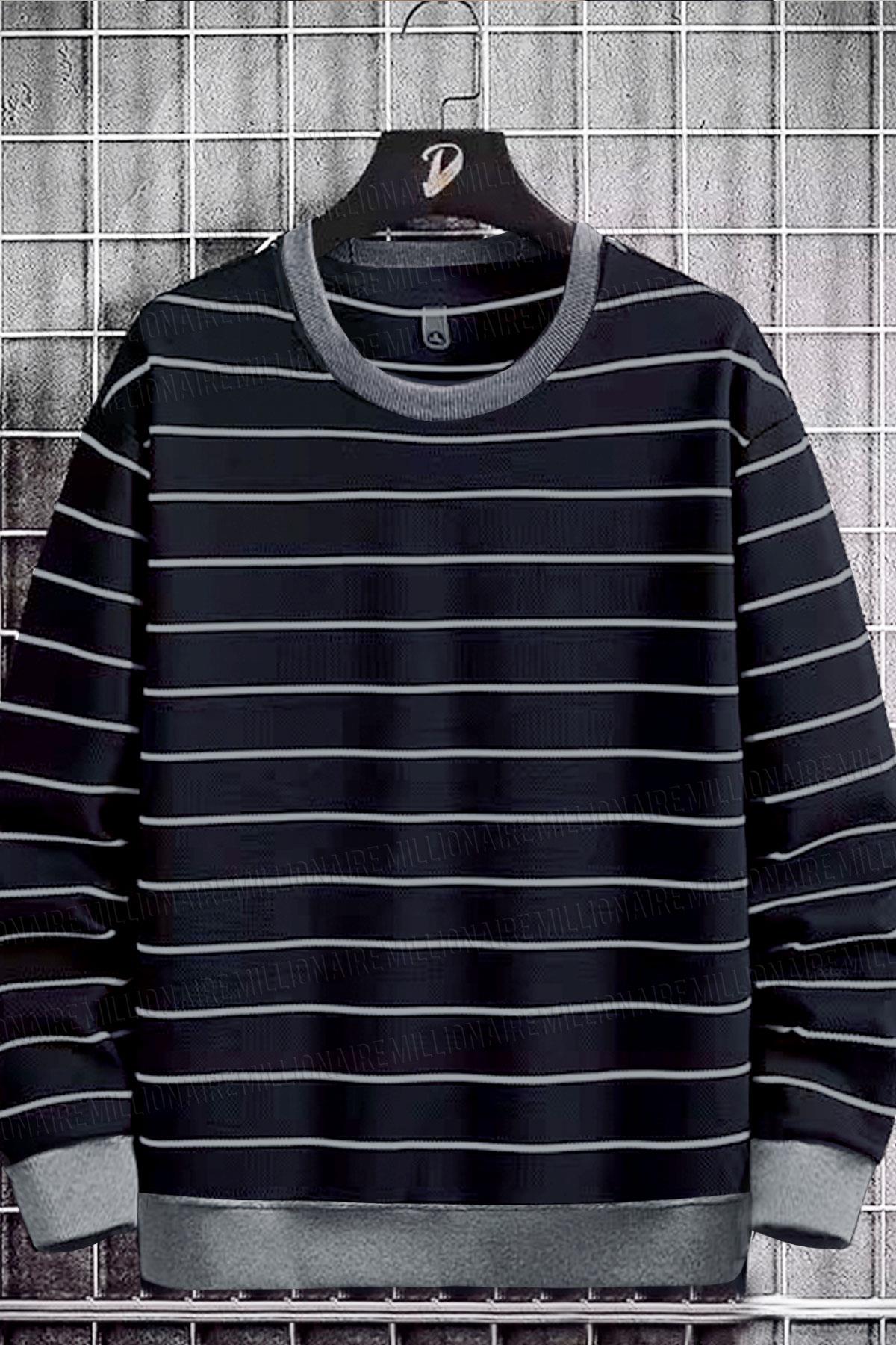 Erkek Lacivert-Gri Çizgil Renk Bloklu 0 Sıfır Yaka Oversize Salaş Bol Kesim Polar Sweatshirt (E6004)