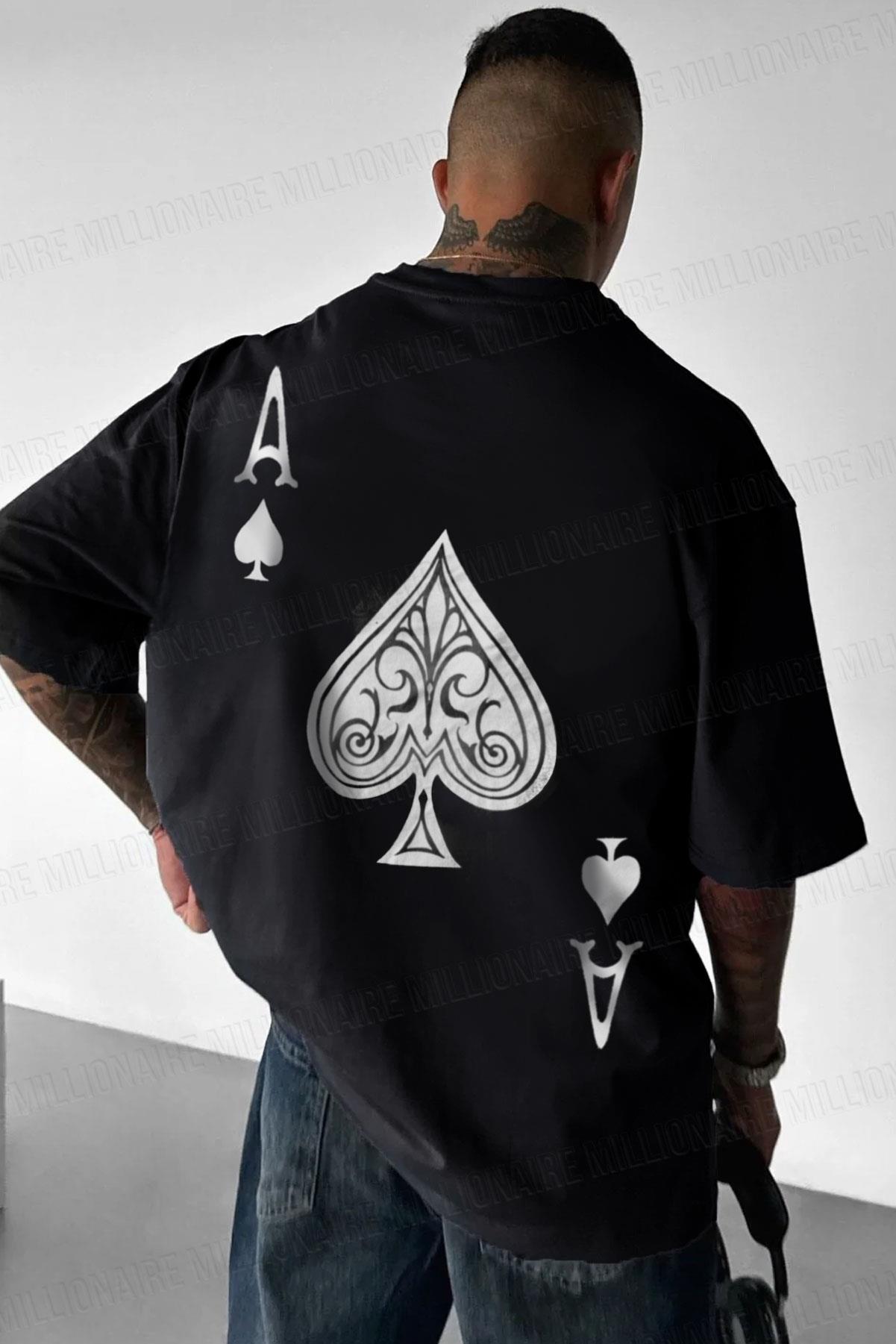 Erkek Maça As Baskılı Siyah Oversize T-Shirt (E6006)