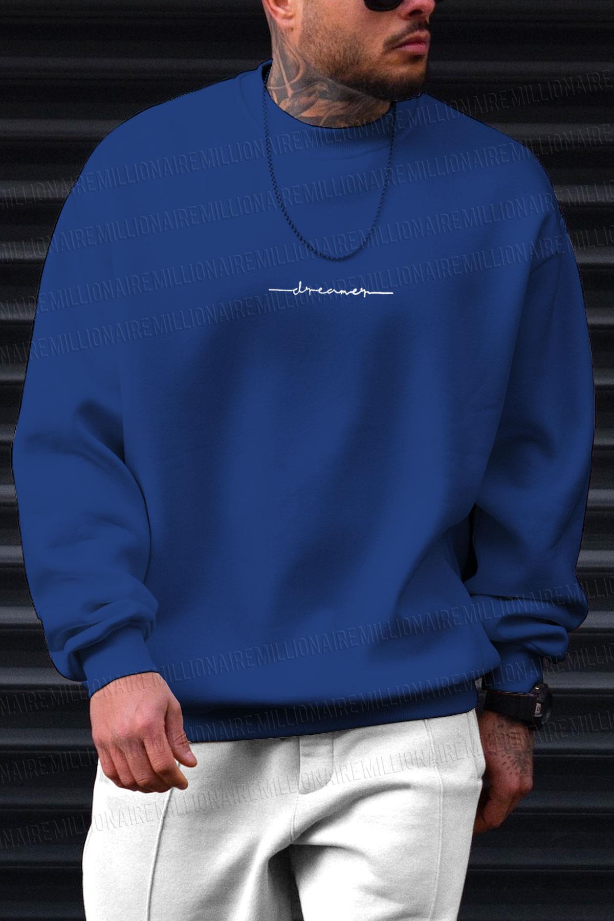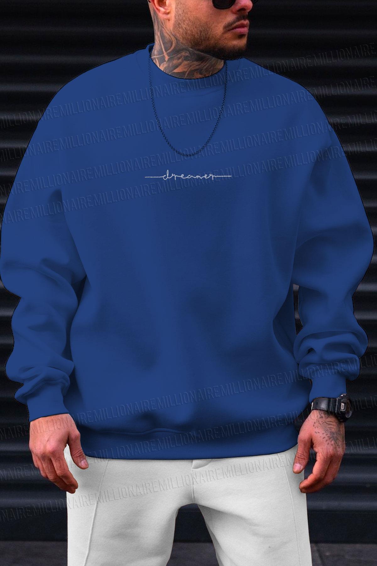 Erkek Saks Mavisi Dreamer Baskılı 0 Sıfır Yaka Oversize Salaş Bol Kesim Polar Sweatshirt (E6004)