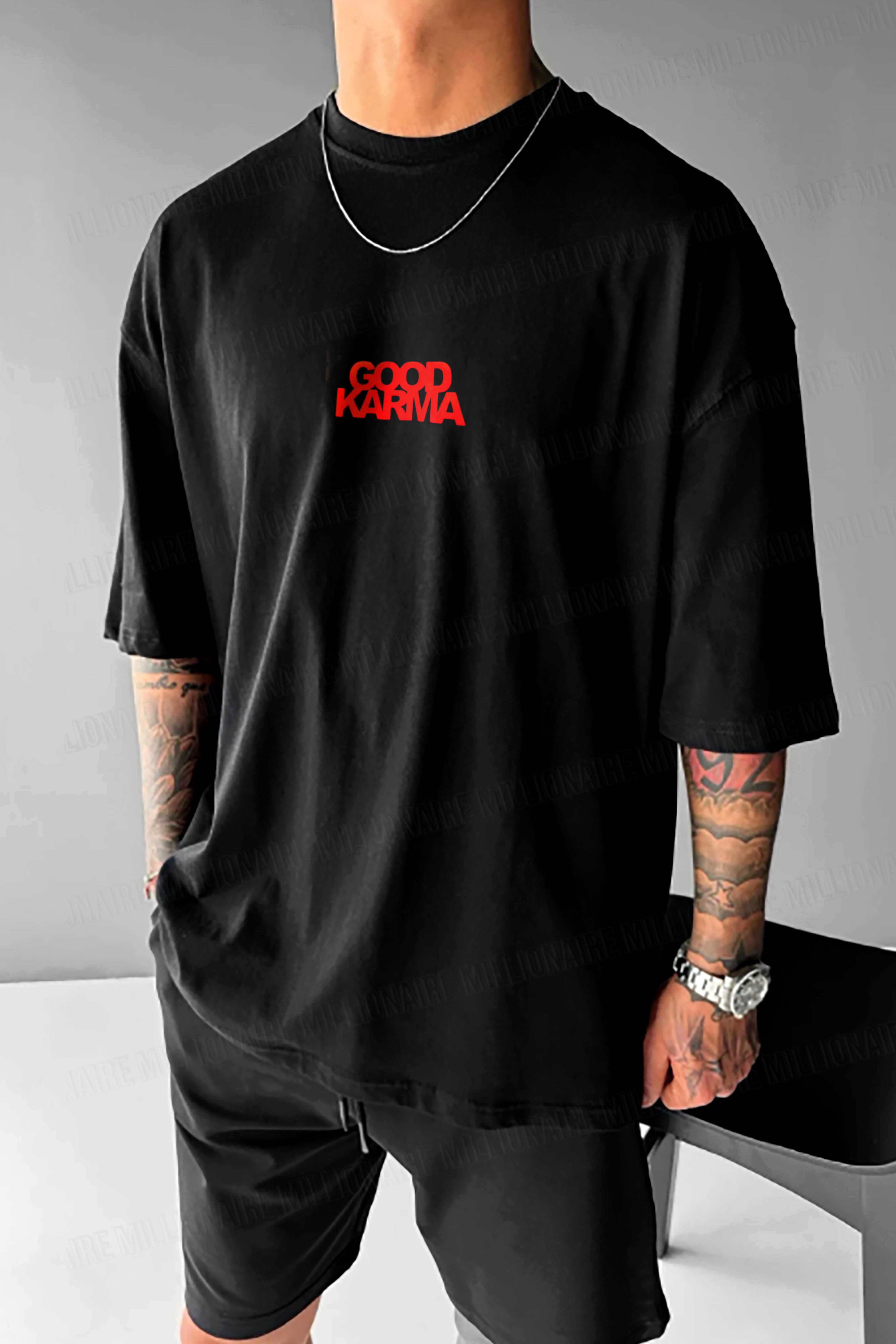 Erkek Siyah Good Karma Oversize Fit Bol Geniş Kalıp Salaş Kesim T-shirt (E2307)