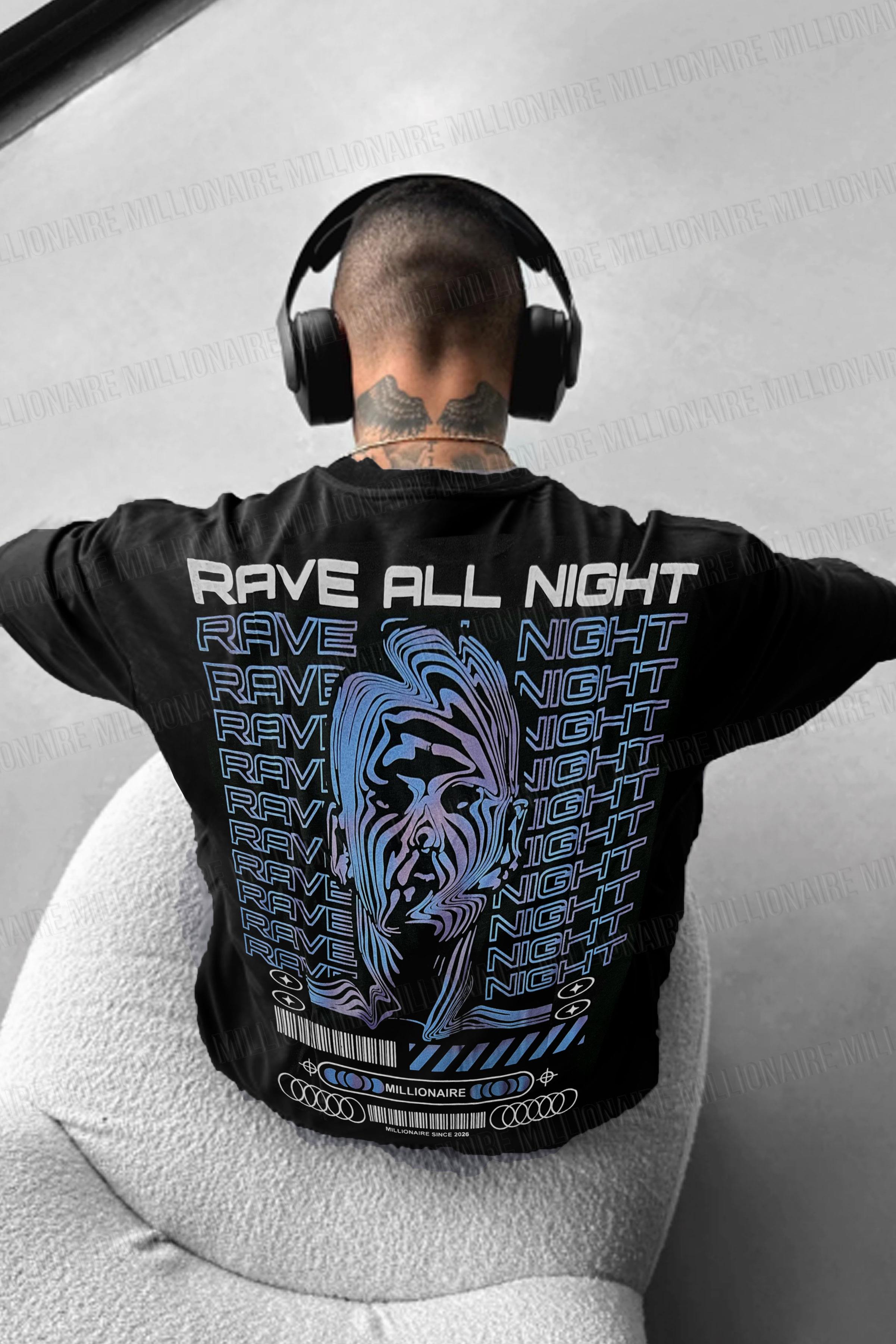 Erkek Siyah Rave All Night Oversize Fit Bol Geniş Kalıp Salaş Kesim T-shirt (E2325)