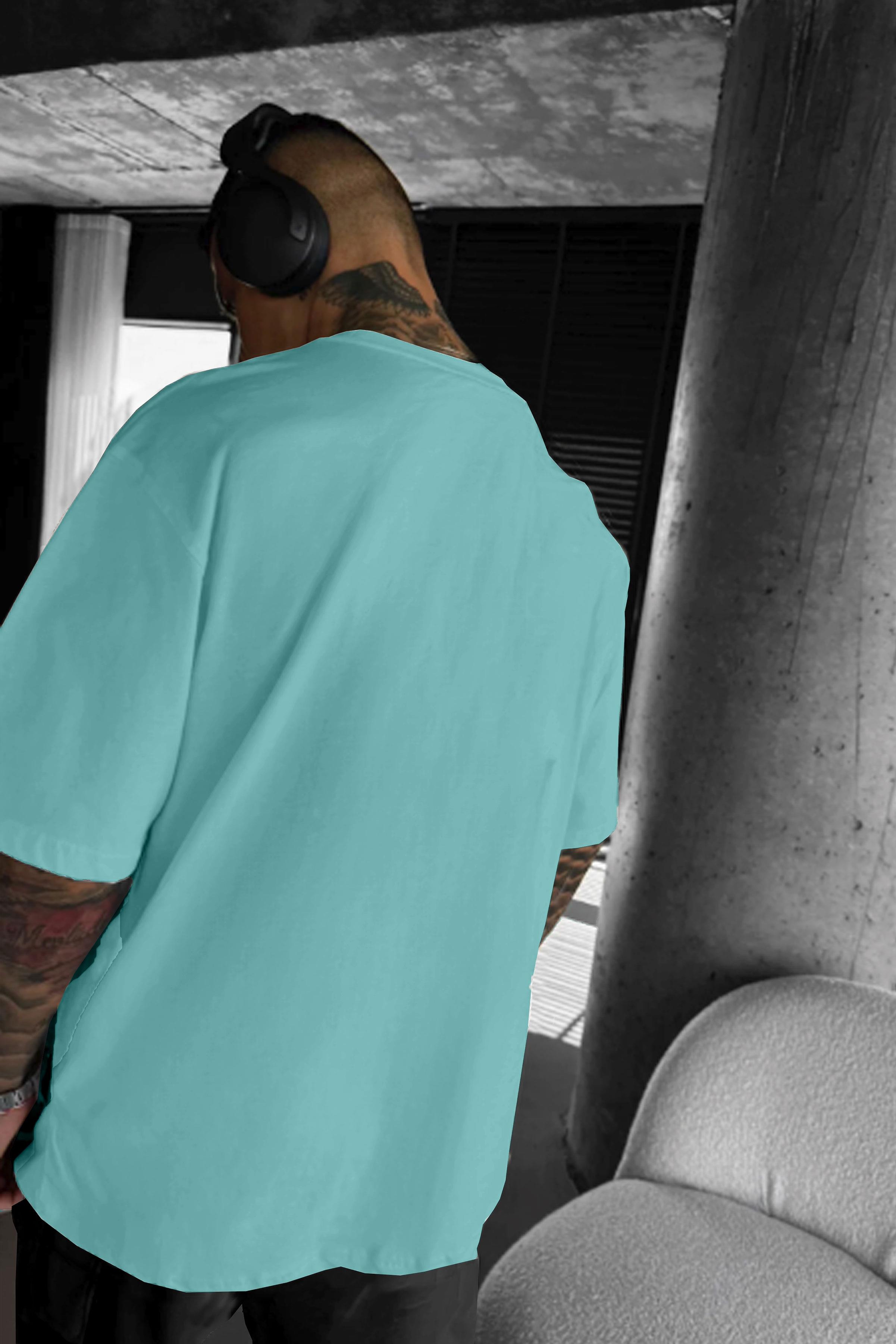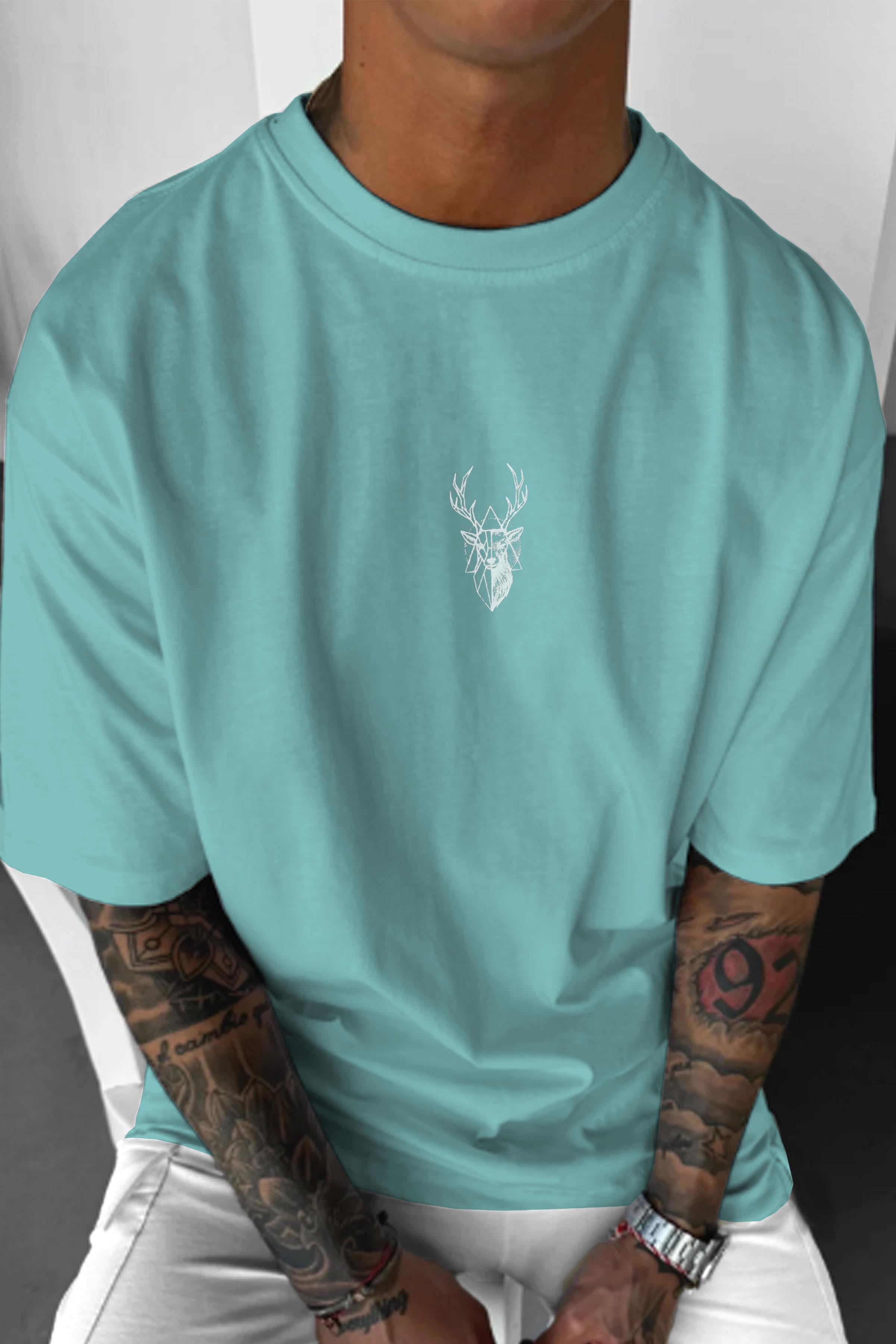 Erkek Turkuaz Geyik Baskılı Oversize Fit Bol Geniş Kalıp Salaş Kesim T-shirt (E2312)