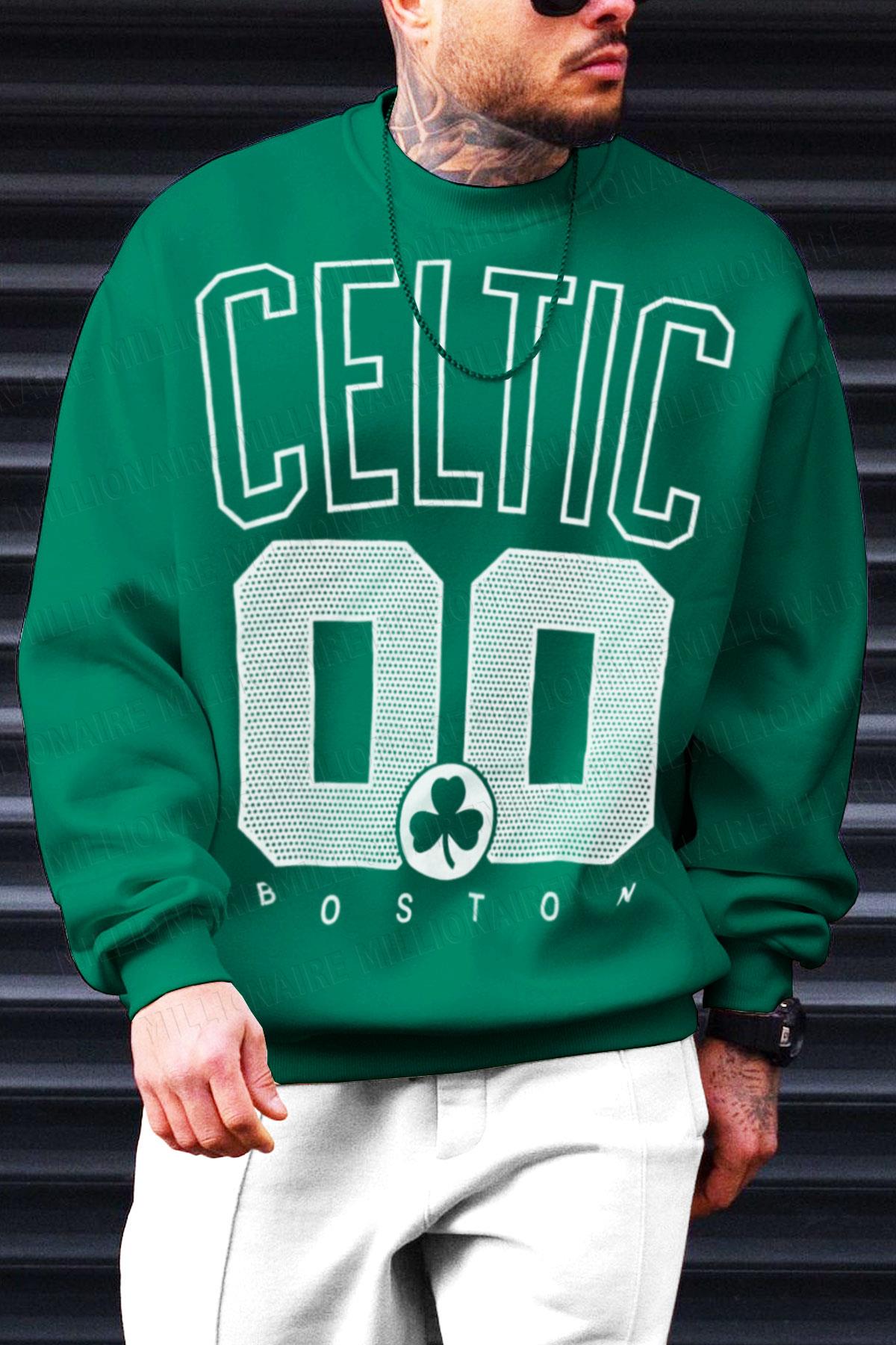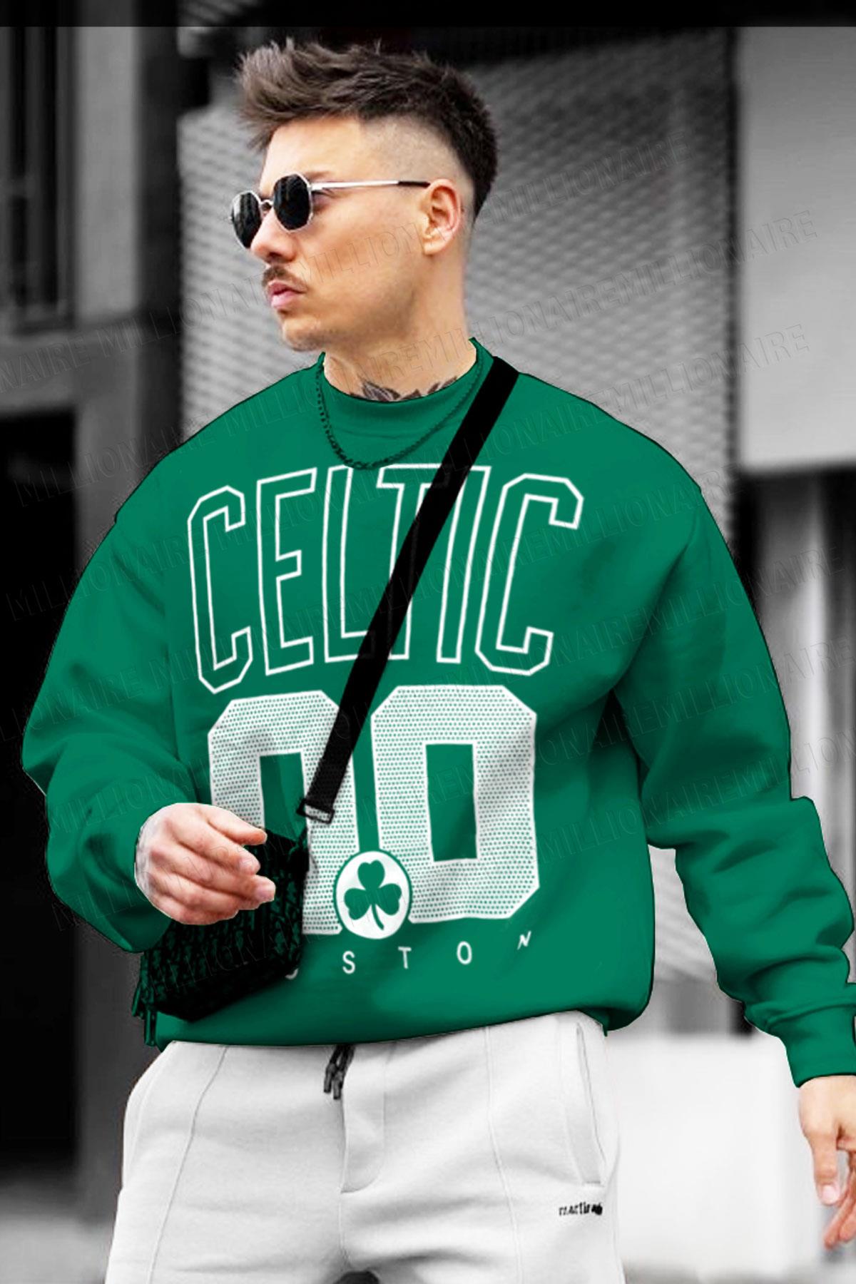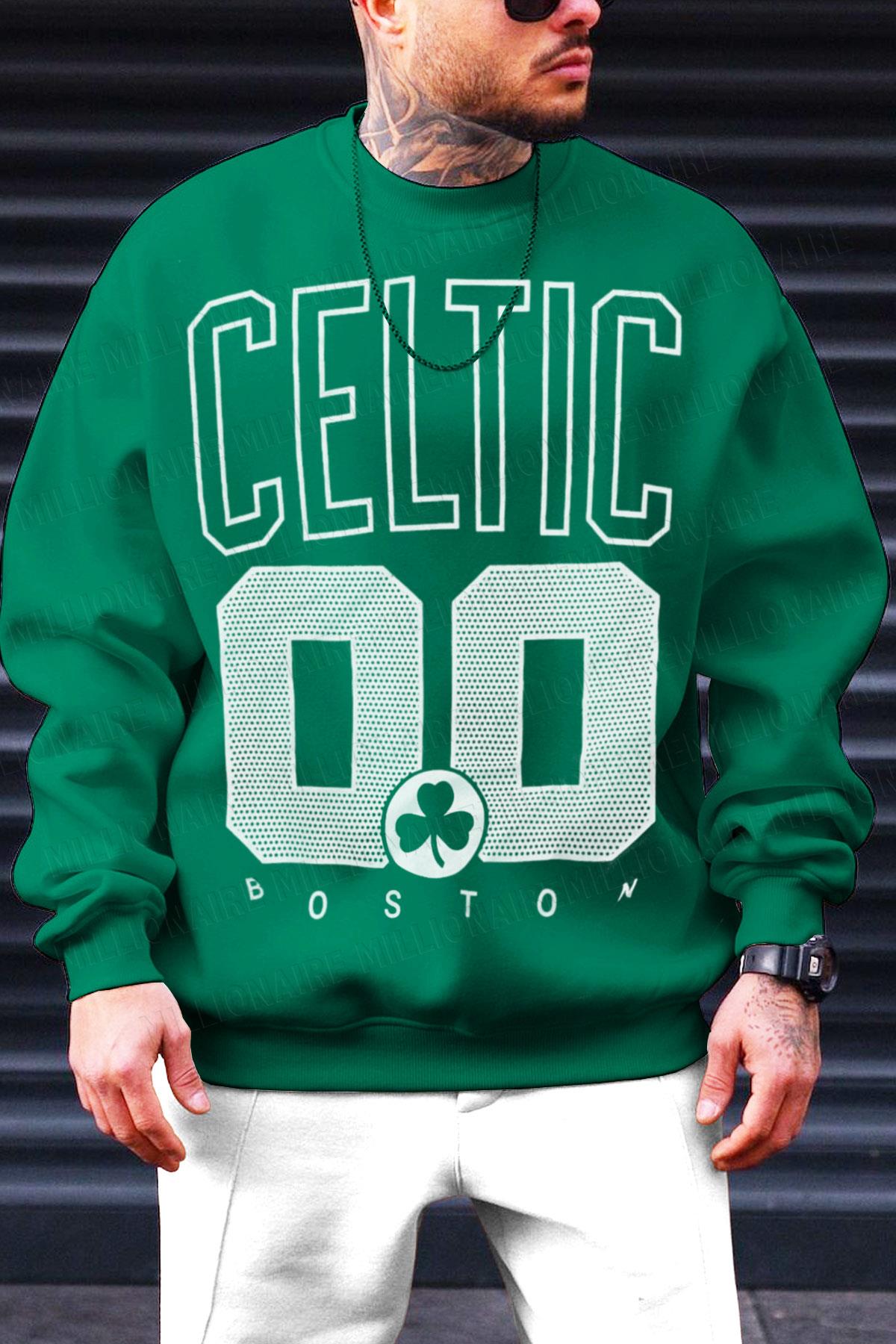 Erkek Yeşil Boston 00 Baskılı 0 Sıfır Yaka Oversize Salaş Bol Kesim Polar Sweatshirt (EK3028)