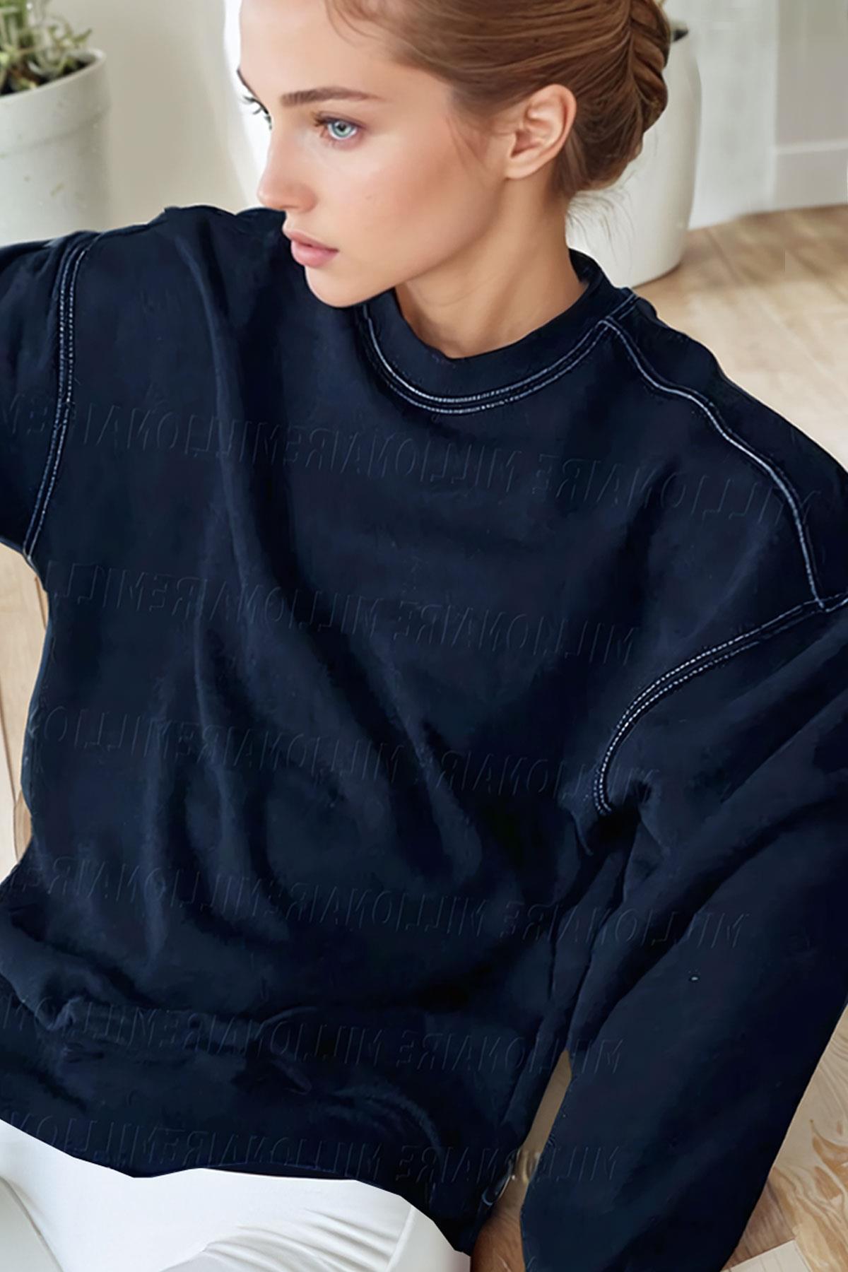 Kadın Dikiş Detaylı Lacivert Basic 0 Sıfır Yaka Baskısız Düz Oversize Salaş Bol Kesim Polar Sweatshirt (SK6000)