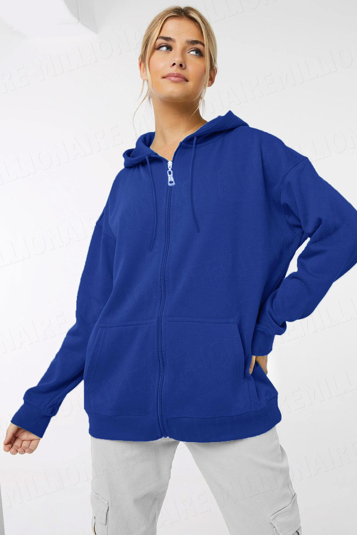 Kadin Saks Mavisi Kapüşonlu Fermuarlı 3 Üç İplik Polar Kanguru Oversize Salaş Sweatshirt Zip Up Hoodie (K2204)